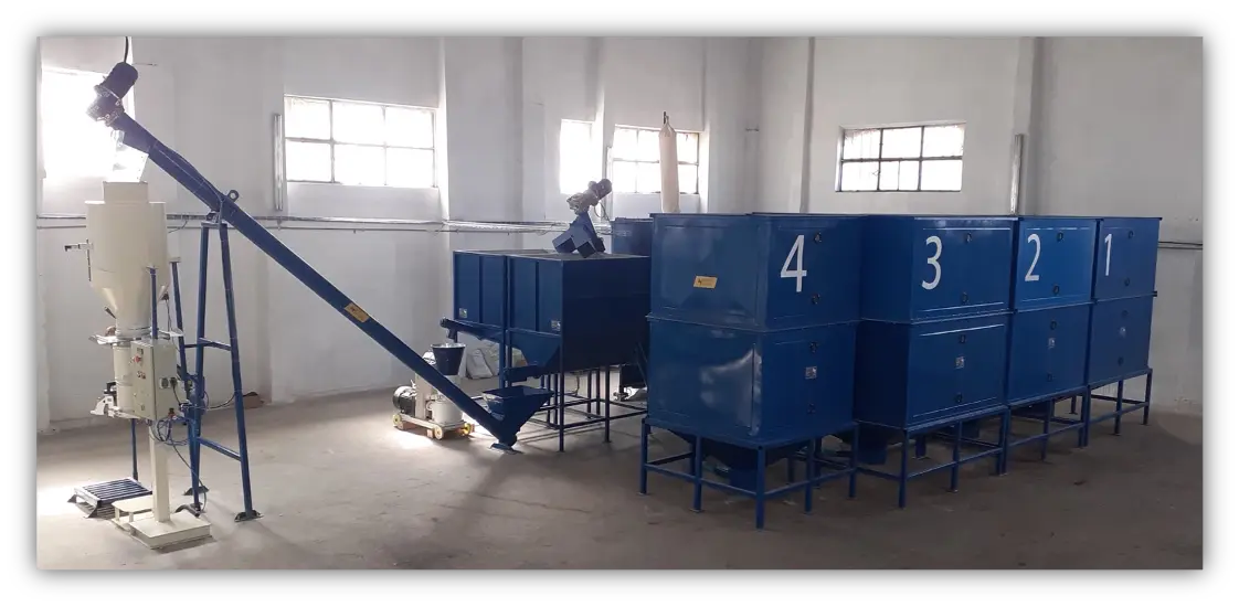 Stație de ambalare pentru dozarea și împachetarea furajului finit în saci, pregătit pentru depozitare sau distribuție.